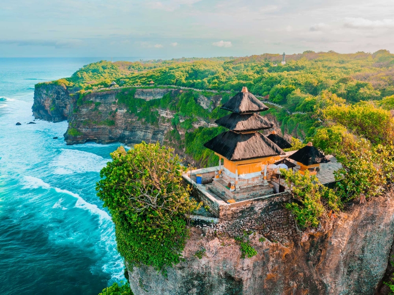 - En fin d’après-midi, vous prenez la route pour la péninsule de Bukit, au sud de Bali, en direction du temple d’Uluwatu. Perché à plus de 70 mètres au-dessus de l’océan Indien, ce sanctuaire du XIe siècle est l’un des six temples les plus sacrés de l’île. Il est dédié à Rudra, dieu hindou des éléments et du vent, et offre un point de vue spectaculaire, notamment au moment du coucher de soleil, quand les falaises embrasées plongent dans l’eau.